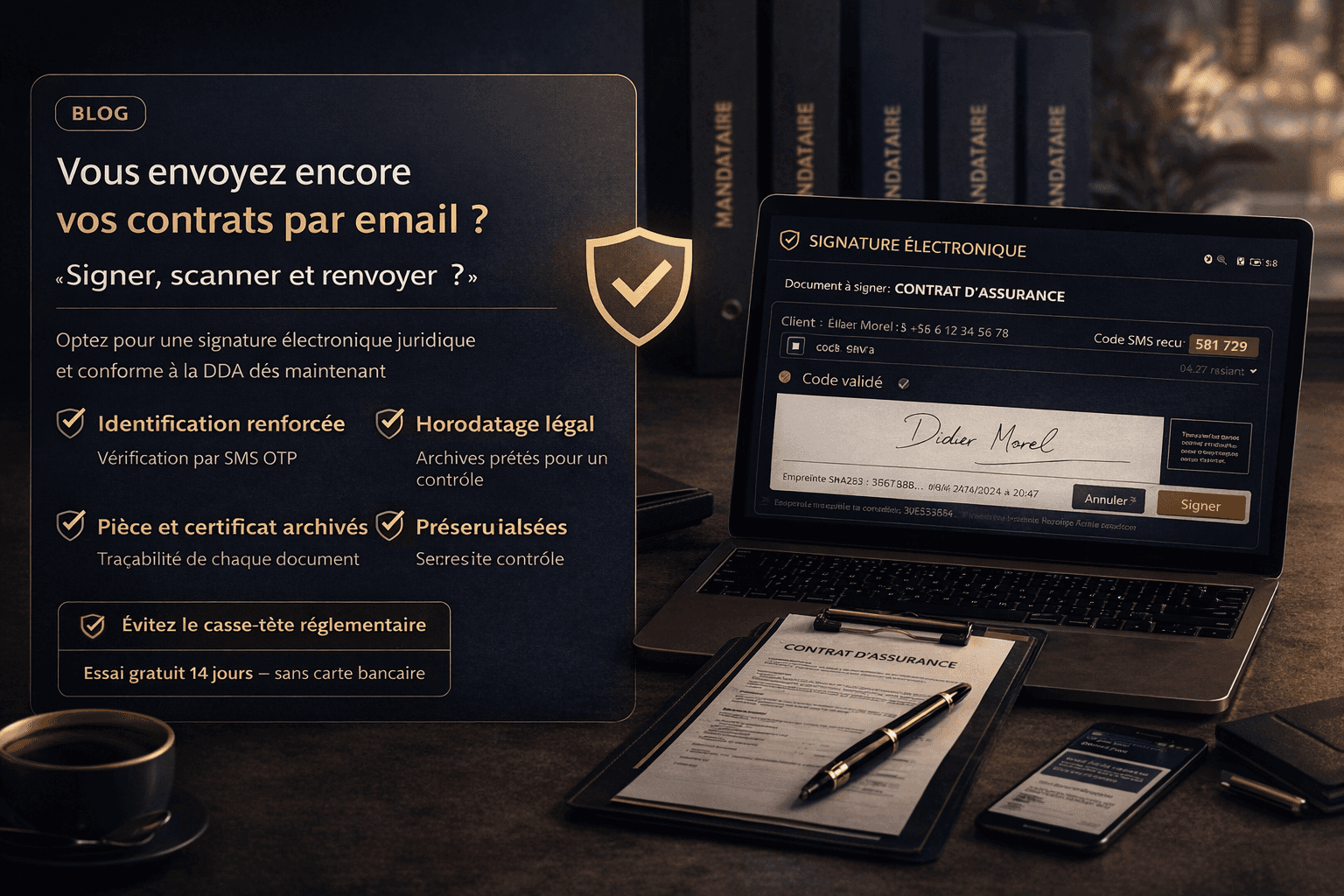 Vous envoyez encore vos contrats par email en demandant à votre client de "signer, scanner et renvoyer" ? Ou vous utilisez un outil de signature en ligne dont vous n'êtes pas sûr qu'il soit conforme à ce que la DDA exige ?