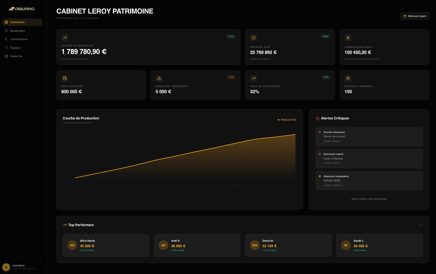 Assurevo intègre nativement une signature électronique avancée conforme eIDAS. Le document est généré depuis le dossier client, envoyé au signataire, et revient automatiquement archivé avec son certificat d'horodatage. Aucun outil tiers, aucune manipulation de fichier, aucun risque de rupture de traçabilité.